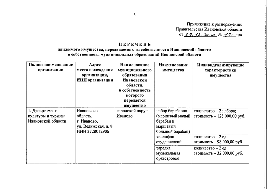 Распоряжение Правительства Ивановской области от 07.12.2020 N 172-рп "О передаче движимого имущества из собственности Ивановской области в собственность муниципальных образований Ивановской области"
