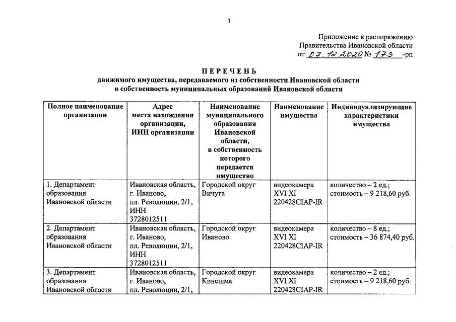 Распоряжение Правительства Ивановской области от 07.12.2020 N 173-рп "О передаче движимого имущества из собственности Ивановской области в собственность муниципальных образований Ивановской области"