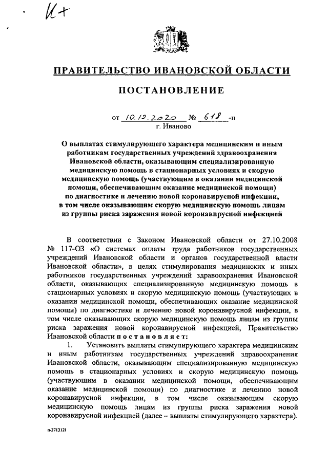Постановление Правительства Ивановской области от 10.12.2020 N 618-п "О выплатах стимулирующего характера медицинским и иным работникам государственных учреждений здравоохранения Ивановской области, оказывающим специализированную медицинскую помощь в стационарных условиях и скорую медицинскую помощь (участвующим в оказании медицинской помощи, обеспечивающим оказание медицинской помощи) по диагностике и лечению новой коронавирусной инфекции, в том числе оказывающим скорую медицинскую помощь лицам из группы риска заражения новой коронавирусной инфекцией" (вместе с "Порядком предоставления выплат стимулирующего характера медицинским и иным работникам государственных учреждений здравоохранения Ивановской области, оказывающим специализированную медицинскую помощь в стационарных условиях и скорую медицинскую помощь (участвующим в оказании медицинской помощи, обеспечивающим оказание медицинской помощи) по диагностике и лечению новой коронавирусной инфекции, в том числе оказывающим скорую медицинскую помощь лицам из группы риска заражения новой коронавирусной инфекцией")