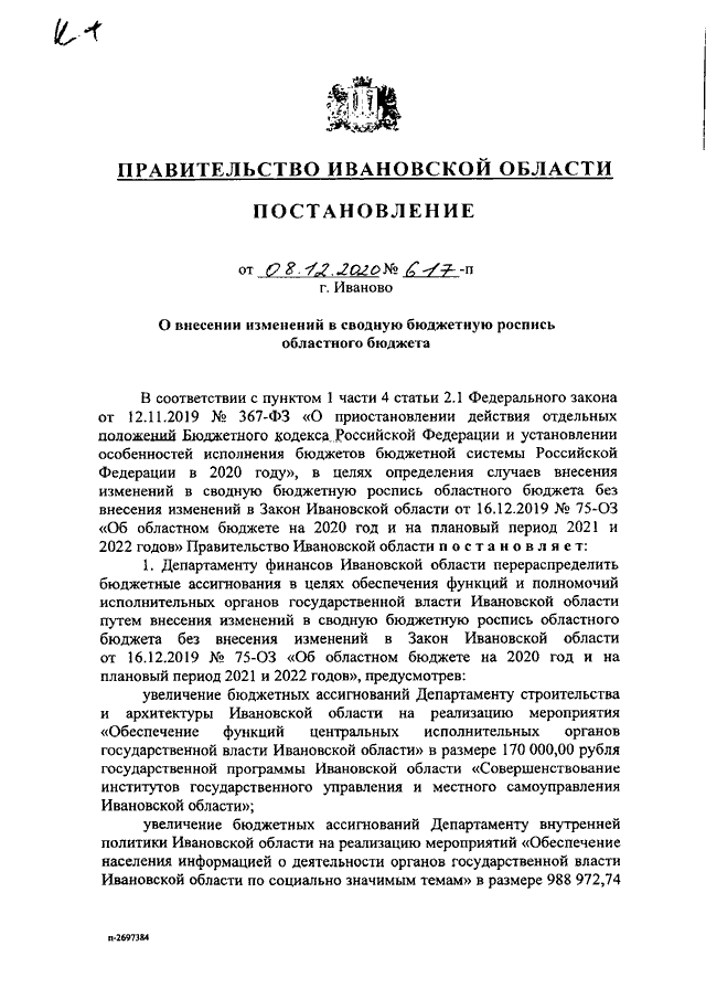 Постановление Правительства Ивановской области от 08.12.2020 N 617-п "О внесении изменений в сводную бюджетную роспись областного бюджета"