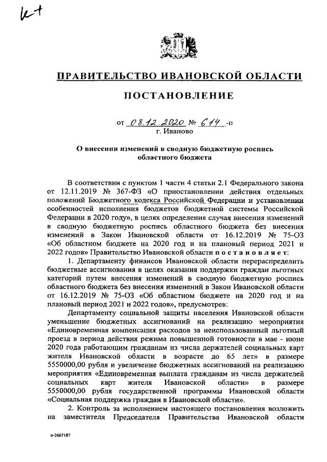 Постановление Правительства Ивановской области от 08.12.2020 N 614-п "О внесении изменений в сводную бюджетную роспись областного бюджета"