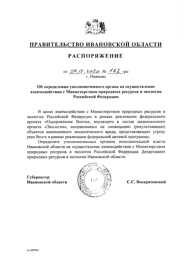 Распоряжение Правительства Ивановской области от 07.12.2020 N 162-рп "Об определении уполномоченного органа на осуществление взаимодействия с Министерством природных ресурсов и экологии Российской Федерации"