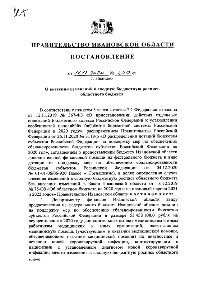 Постановление Правительства Ивановской области от 11.12.2020 N 620-п "О внесении изменений в сводную бюджетную роспись областного бюджета"