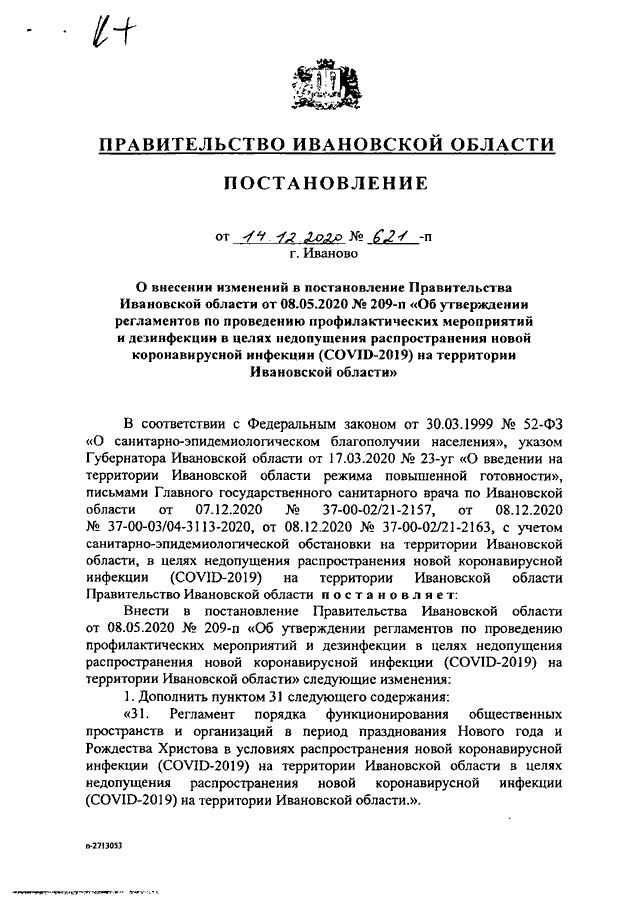 Постановление Правительства Ивановской области от 14.12.2020 N 621-п "О внесении изменений в постановление Правительства Ивановской области от 08.05.2020 N 209-п "Об утверждении регламентов по проведению профилактических мероприятий и дезинфекции в целях недопущения распространения новой коронавирусной инфекции (COVID-2019) на территории Ивановской области" (вместе с "Регламентом порядка функционирования общественных пространств и организаций в период празднования Нового года и Рождества Христова в условиях распространения новой коронавирусной инфекции (COVID-2019) на территории Ивановской области в целях недопущения распространения новой коронавирусной инфекции (COVID-2019) на территории Ивановской области")
