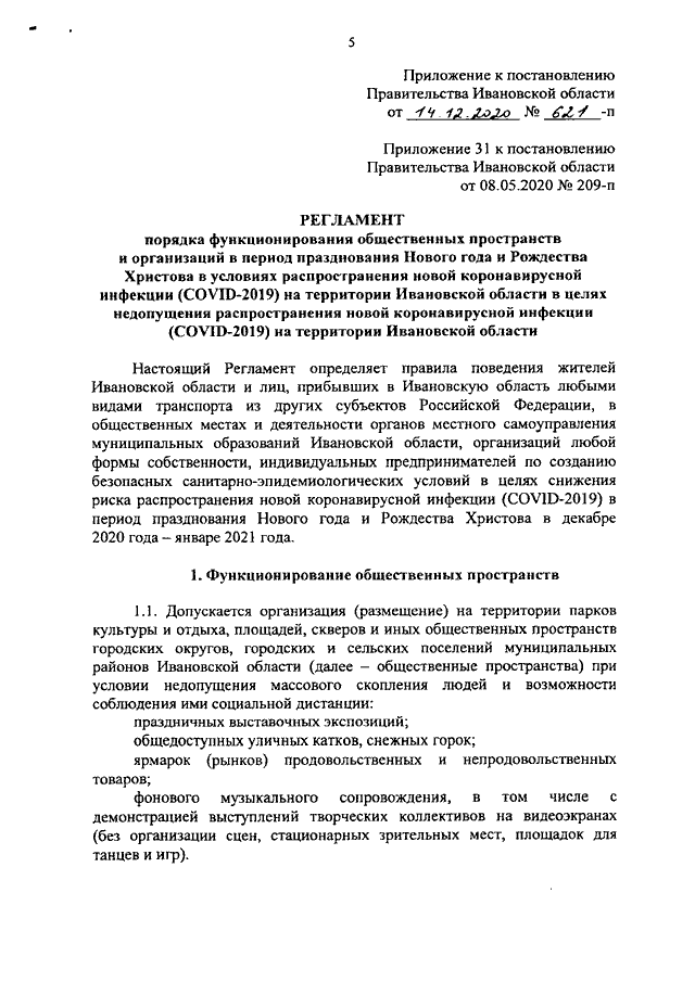 Постановление Правительства Ивановской области от 14.12.2020 N 621-п "О внесении изменений в постановление Правительства Ивановской области от 08.05.2020 N 209-п "Об утверждении регламентов по проведению профилактических мероприятий и дезинфекции в целях недопущения распространения новой коронавирусной инфекции (COVID-2019) на территории Ивановской области" (вместе с "Регламентом порядка функционирования общественных пространств и организаций в период празднования Нового года и Рождества Христова в условиях распространения новой коронавирусной инфекции (COVID-2019) на территории Ивановской области в целях недопущения распространения новой коронавирусной инфекции (COVID-2019) на территории Ивановской области")