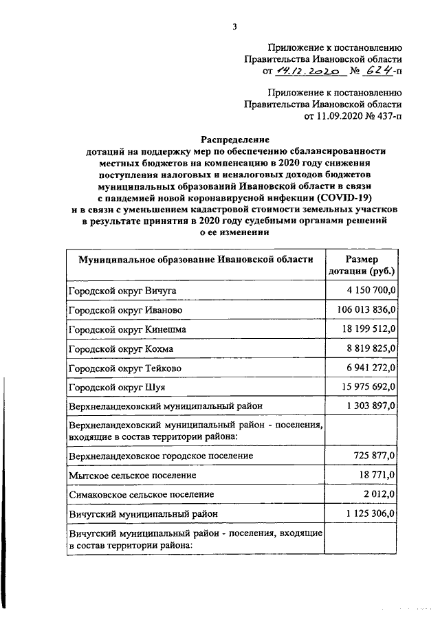Постановление Правительства Ивановской области от 14.12.2020 N 624-п "О внесении изменения в постановление Правительства Ивановской области от 11.09.2020 N 437-п "О распределении дотаций на поддержку мер по обеспечению сбалансированности местных бюджетов на компенсацию в 2020 году снижения поступления налоговых и неналоговых доходов бюджетов муниципальных образований Ивановской области в связи с пандемией новой коронавирусной инфекции (COVID-19) и в связи с уменьшением кадастровой стоимости земельных участков в результате принятия в 2020 году судебными органами решений о ее изменении"