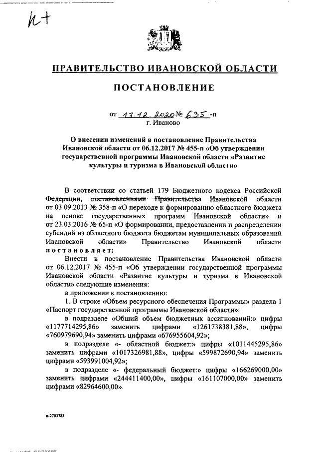 Постановление Правительства Ивановской области от 17.12.2020 N 635-п "О внесении изменений в постановление Правительства Ивановской области от 06.12.2017 N 455-п "Об утверждении государственной программы Ивановской области "Развитие культуры и туризма в Ивановской области"