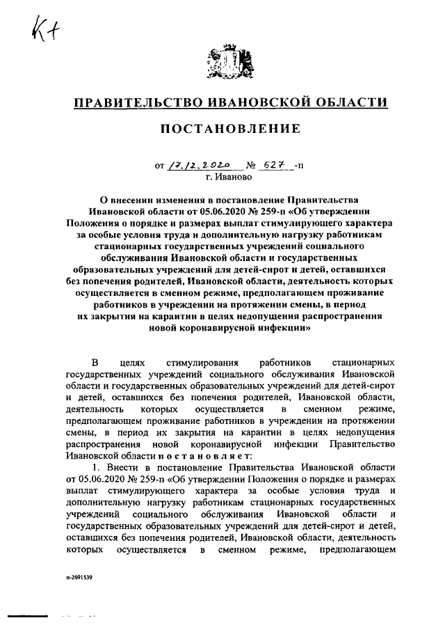 Постановление Правительства Ивановской области от 17.12.2020 N 627-п "О внесении изменения в постановление Правительства Ивановской области от 05.06.2020 N 259-п "Об утверждении Положения о порядке и размерах выплат стимулирующего характера за особые условия труда и дополнительную нагрузку работникам стационарных государственных учреждений социального обслуживания Ивановской области и государственных образовательных учреждений для детей-сирот и детей, оставшихся без попечения родителей, Ивановской области, деятельность которых осуществляется в сменном режиме, предполагающем проживание работников в учреждении на протяжении смены, в период их закрытия на карантин в целях недопущения распространения новой коронавирусной инфекции"