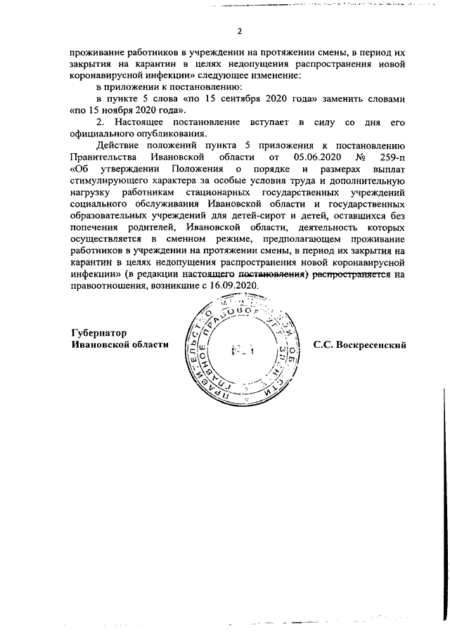 Постановление Правительства Ивановской области от 17.12.2020 N 627-п "О внесении изменения в постановление Правительства Ивановской области от 05.06.2020 N 259-п "Об утверждении Положения о порядке и размерах выплат стимулирующего характера за особые условия труда и дополнительную нагрузку работникам стационарных государственных учреждений социального обслуживания Ивановской области и государственных образовательных учреждений для детей-сирот и детей, оставшихся без попечения родителей, Ивановской области, деятельность которых осуществляется в сменном режиме, предполагающем проживание работников в учреждении на протяжении смены, в период их закрытия на карантин в целях недопущения распространения новой коронавирусной инфекции"