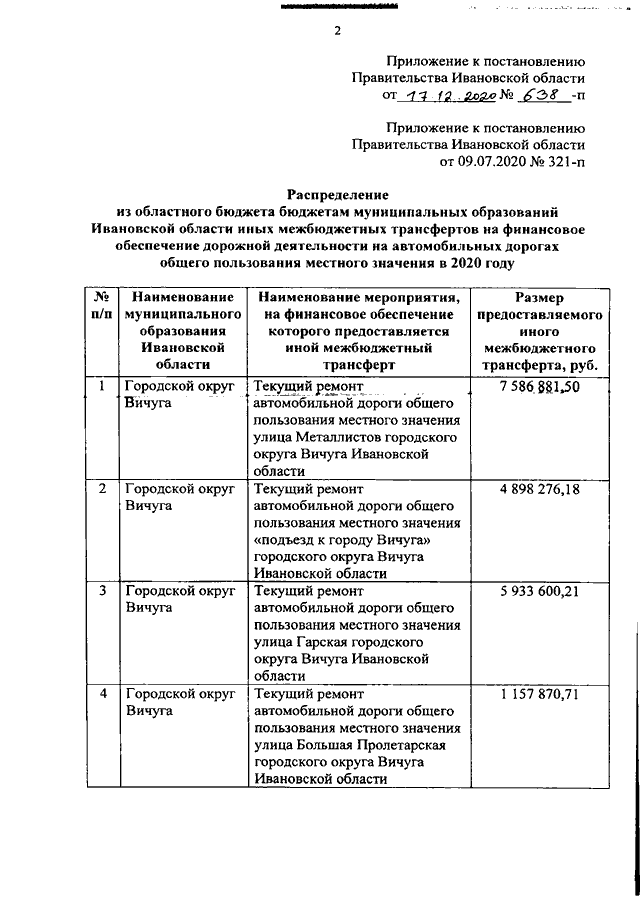Постановление Правительства Ивановской области от 17.12.2020 N 638-п "О внесении изменения в постановление Правительства Ивановской области от 09.07.2020 N 321-п "О распределении из областного бюджета бюджетам муниципальных образований Ивановской области иных межбюджетных трансфертов на финансовое обеспечение дорожной деятельности на автомобильных дорогах общего пользования местного значения в 2020 году"