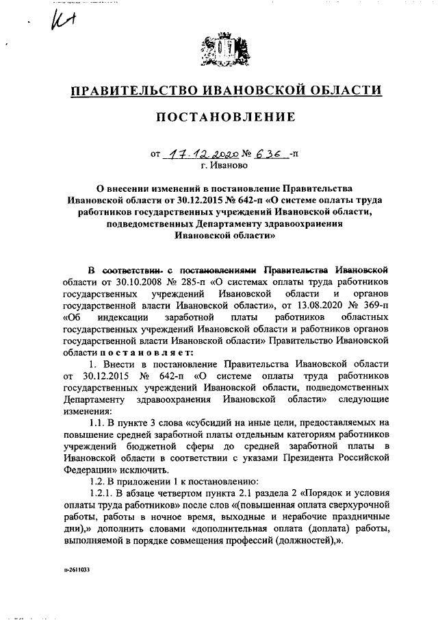 Постановление Правительства Ивановской области от 17.12.2020 N 636-п "О внесении изменений в постановление Правительства Ивановской области от 30.12.2015 N 642-п "О системе оплаты труда работников государственных учреждений Ивановской области, подведомственных Департаменту здравоохранения Ивановской области"