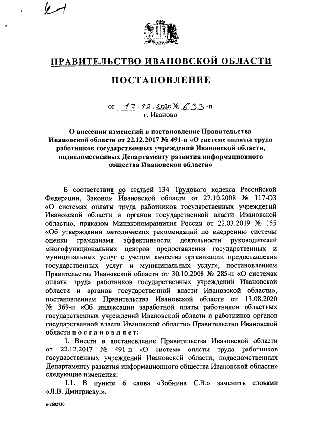 Постановление Правительства Ивановской области от 17.12.2020 N 633-п "О внесении изменений в постановление Правительства Ивановской области от 22.12.2017 N 491-п "О системе оплаты труда работников государственных учреждений Ивановской области, подведомственных Департаменту развития информационного общества Ивановской области"