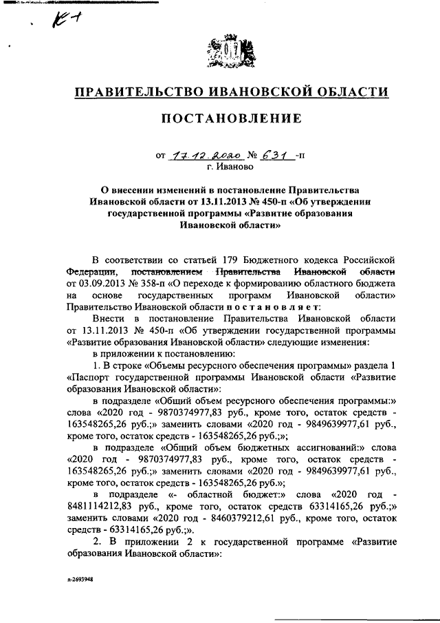 Постановление Правительства Ивановской области от 17.12.2020 N 631-п "О внесении изменений в постановление Правительства Ивановской области от 13.11.2013 N 450-п "Об утверждении государственной программы "Развитие образования Ивановской области"