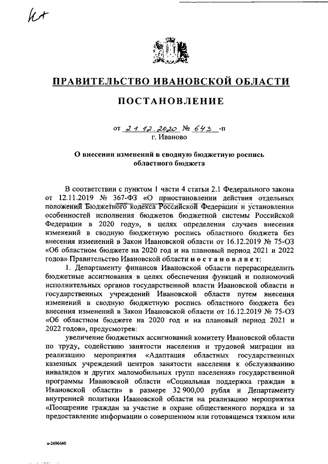 Постановление Правительства Ивановской области от 21.12.2020 N 643-п "О внесении изменений в сводную бюджетную роспись областного бюджета"
