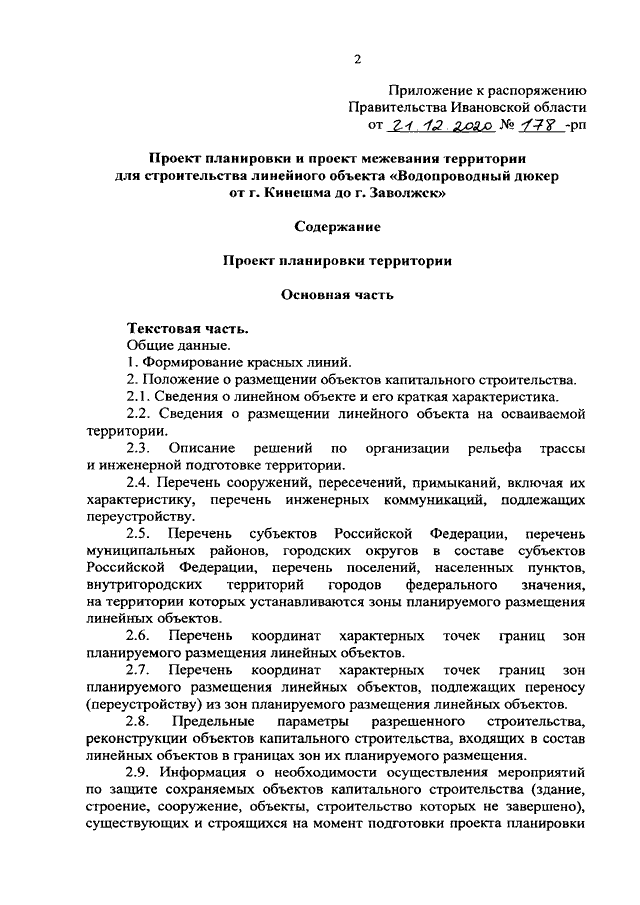 Распоряжение Правительства Ивановской области от 21.12.2020 N 178-рп "Об утверждении проекта планировки и проекта межевания территории для строительства линейного объекта "Водопроводный дюкер от г. Кинешма до г. Заволжск"