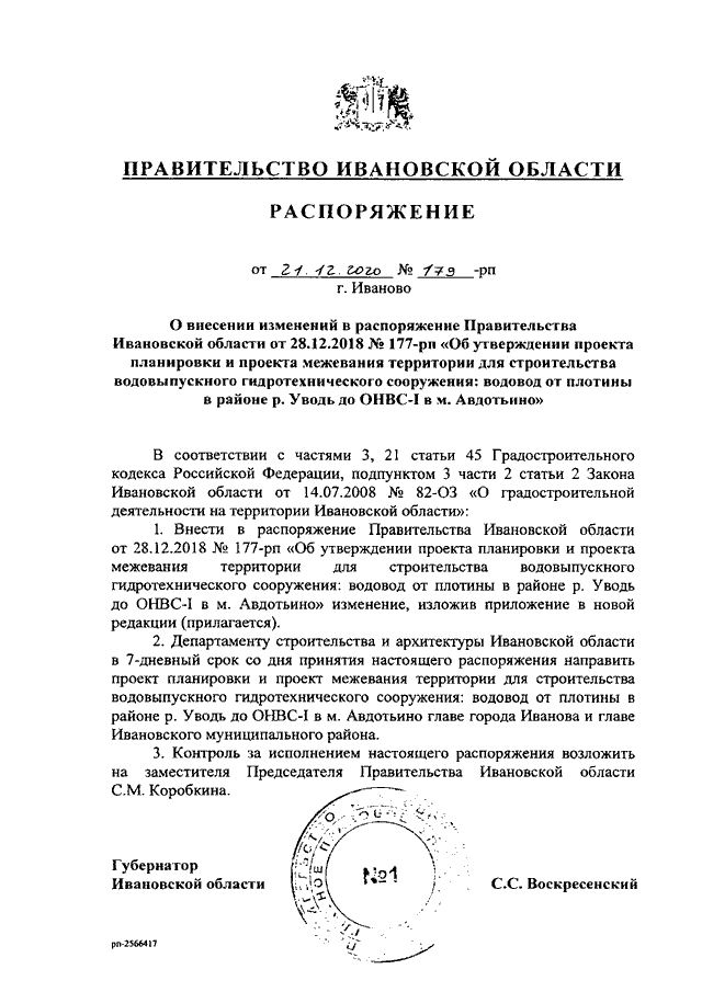 Распоряжение Правительства Ивановской области от 21.12.2020 N 179-рп "О внесении изменений в распоряжение Правительства Ивановской области от 28.12.2018 N 177-рп "Об утверждении проекта планировки и проекта межевания территории для строительства водовыпускного гидротехнического сооружения: водовод от плотины в районе р. Уводь до ОНВС-I в м. Авдотьино"