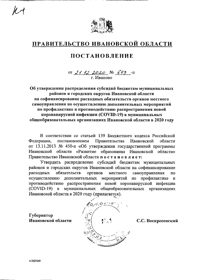 Постановление Правительства Ивановской области от 21.12.2020 N 649-п "Об утверждении распределения субсидий бюджетам муниципальных районов и городских округов Ивановской области на софинансирование расходных обязательств органов местного самоуправления по осуществлению дополнительных мероприятий по профилактике и противодействию распространения новой коронавирусной инфекции (COVID-19) в муниципальных общеобразовательных организациях Ивановской области в 2020 году"