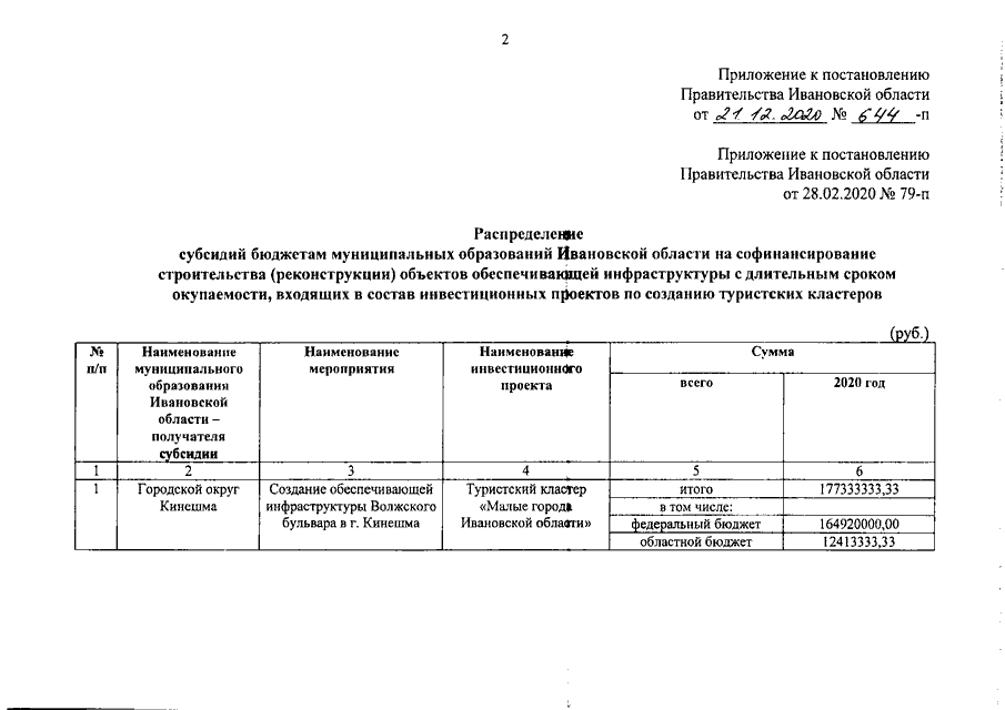 Постановление Правительства Ивановской области от 21.12.2020 N 644-п "О внесении изменения в постановление Правительства Ивановской области от 28.02.2020 N 79-п "О распределении субсидий бюджетам муниципальных образований Ивановской области на софинансирование строительства (реконструкции) объектов обеспечивающей инфраструктуры с длительным сроком окупаемости, входящих в состав инвестиционных проектов по созданию туристских кластеров"