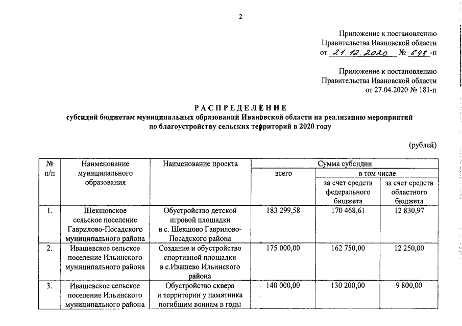 Постановление Правительства Ивановской области от 21.12.2020 N 648-п "О внесении изменения в постановление Правительства Ивановской области от 27.04.2020 N 181-п "О распределении субсидий бюджетам муниципальных образований Ивановской области на реализацию мероприятий по благоустройству сельских территорий в 2020 году"
