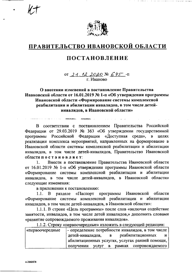 Постановление Правительства Ивановской области от 21.12.2020 N 645-п "О внесении изменений в постановление Правительства Ивановской области от 16.01.2019 N 1-п "Об утверждении программы Ивановской области "Формирование системы комплексной реабилитации и абилитации инвалидов, в том числе детей-инвалидов, в Ивановской области" (вместе с "Перечнем мероприятий программы Ивановской области "Формирование системы комплексной реабилитации и абилитации инвалидов, в том числе детей-инвалидов, в Ивановской области")