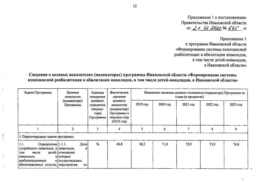 Постановление Правительства Ивановской области от 21.12.2020 N 645-п "О внесении изменений в постановление Правительства Ивановской области от 16.01.2019 N 1-п "Об утверждении программы Ивановской области "Формирование системы комплексной реабилитации и абилитации инвалидов, в том числе детей-инвалидов, в Ивановской области" (вместе с "Перечнем мероприятий программы Ивановской области "Формирование системы комплексной реабилитации и абилитации инвалидов, в том числе детей-инвалидов, в Ивановской области")