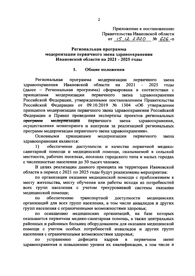 Постановление Правительства Ивановской области от 15.12.2020 N 626-п "Об утверждении Региональной программы модернизации первичного звена здравоохранения Ивановской области на 2021 - 2025 годы"