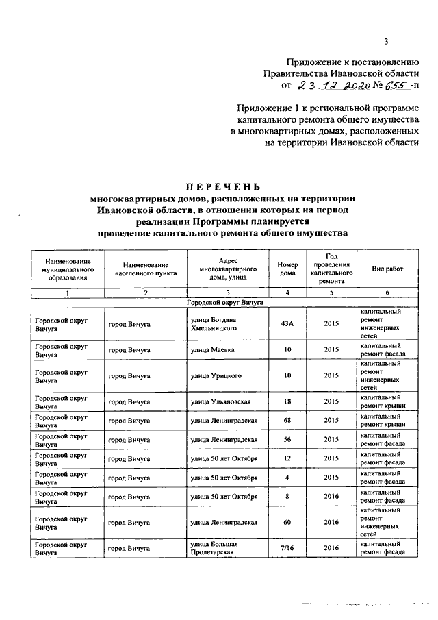 Постановление Правительства Ивановской области от 23.12.2020 N 655-п "О внесении изменений в постановление Правительства Ивановской области от 30.04.2014 N 164-п "Об утверждении региональной программы капитального ремонта общего имущества в многоквартирных домах, расположенных на территории Ивановской области" (вместе с "Перечнем многоквартирных домов, расположенных на территории Ивановской области, в отношении которых на период реализации программы планируется проведение капитального ремонта общего имущества")