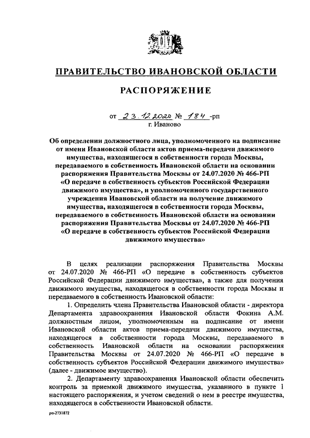 Распоряжение Правительства Ивановской области от 23.12.2020 N 184-рп "Об определении должностного лица, уполномоченного на подписание от имени Ивановской области актов приема-передачи движимого имущества, находящегося в собственности города Москвы, передаваемого в собственность Ивановской области на основании распоряжения Правительства Москвы от 24.07.2020 N 466-РП "О передаче в собственность субъектов Российской Федерации движимого имущества", и уполномоченного государственного учреждения Ивановской области на получение движимого имущества, находящегося в собственности города Москвы, передаваемого в собственность Ивановской области на основании распоряжения Правительства Москвы от 24.07.2020 N 466-РП "О передаче в собственность субъектов Российской Федерации движимого имущества"