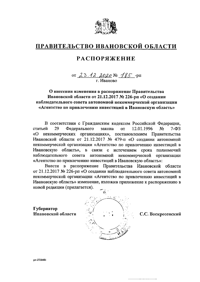 Распоряжение Правительства Ивановской области от 23.12.2020 N 185-рп "О внесении изменения в распоряжение Правительства Ивановской области от 21.12.2017 N 226-рп "О создании наблюдательного совета автономной некоммерческой организации "Агентство по привлечению инвестиций в Ивановскую область"