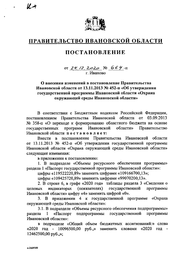 Постановление Правительства Ивановской области от 24.12.2020 N 664-п "О внесении изменений в постановление Правительства Ивановской области от 13.11.2013 N 452-п "Об утверждении государственной программы Ивановской области "Охрана окружающей среды Ивановской области"