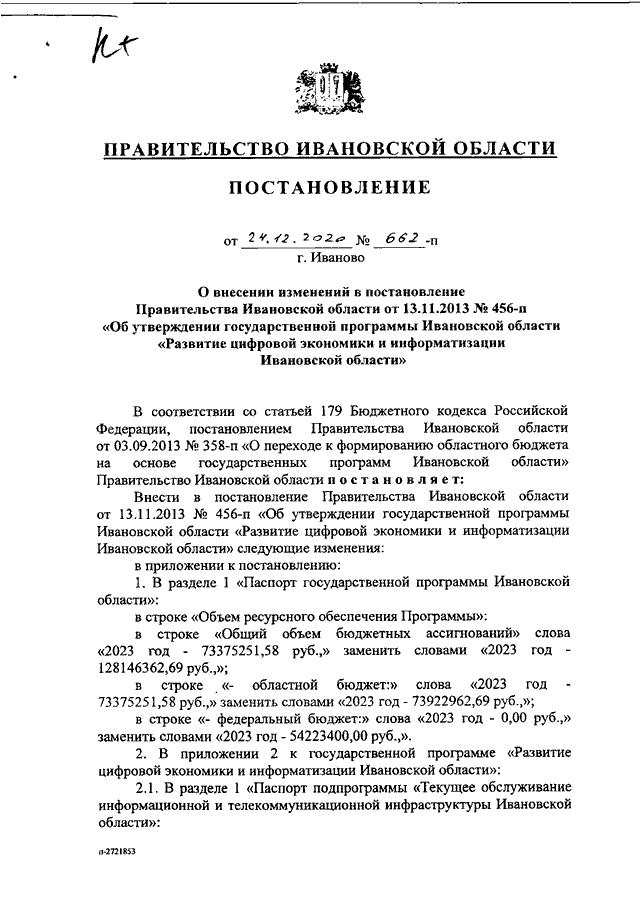 Постановление Правительства Ивановской области от 24.12.2020 N 662-п "О внесении изменений в постановление Правительства Ивановской области от 13.11.2013 N 456-п "Об утверждении государственной программы Ивановской области "Развитие цифровой экономики и информатизации Ивановской области"