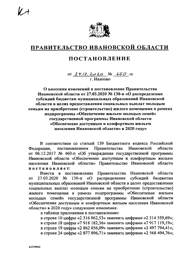 Постановление Правительства Ивановской области от 24.12.2020 N 660-п "О внесении изменений в постановление Правительства Ивановской области от 27.03.2020 N 130-п "О распределении субсидий бюджетам муниципальных образований Ивановской области в целях предоставления социальных выплат молодым семьям на приобретение (строительство) жилого помещения в рамках подпрограммы "Обеспечение жильем молодых семей" государственной программы Ивановской области "Обеспечение доступным и комфортным жильем населения Ивановской области" в 2020 году"