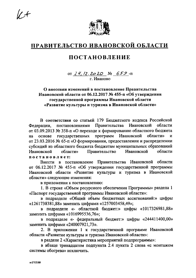 Постановление Правительства Ивановской области от 24.12.2020 N 659-п "О внесении изменений в постановление Правительства Ивановской области от 06.12.2017 N 455-п "Об утверждении государственной программы Ивановской области "Развитие культуры и туризма в Ивановской области"