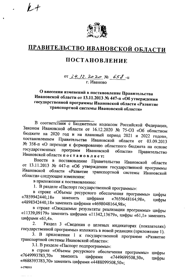 Постановление Правительства Ивановской области от 24.12.2020 N 658-п "О внесении изменений в постановление Правительства Ивановской области от 13.11.2013 N 447-п "Об утверждении государственной программы Ивановской области "Развитие транспортной системы Ивановской области"