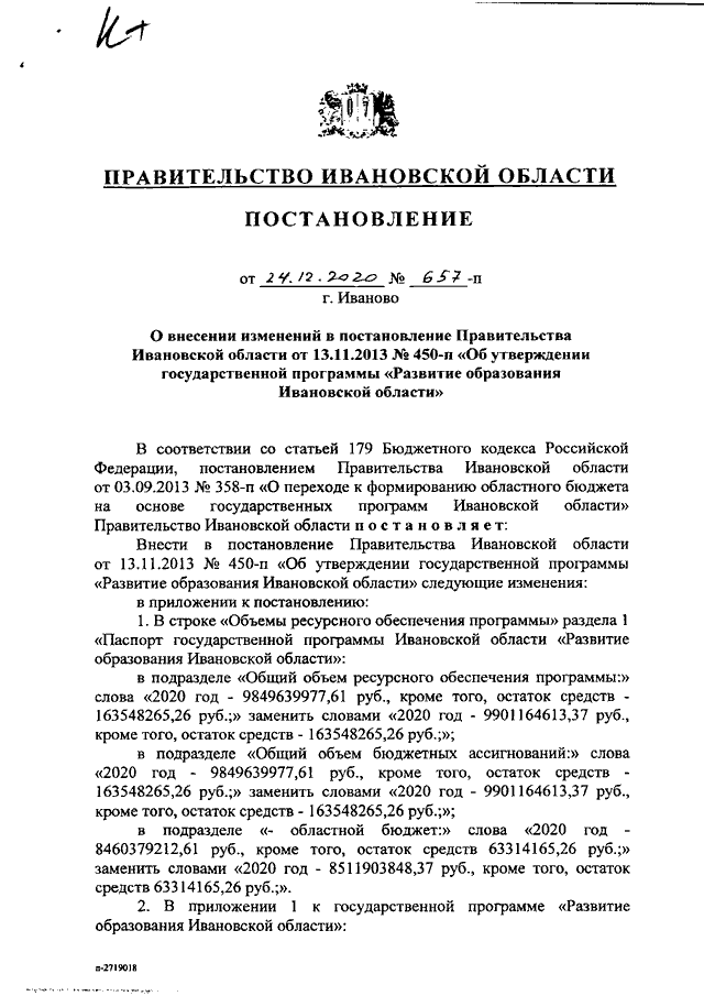 Постановление Правительства Ивановской области от 24.12.2020 N 657-п "О внесении изменений в постановление Правительства Ивановской области от 13.11.2013 N 450-п "Об утверждении государственной программы "Развитие образования Ивановской области"