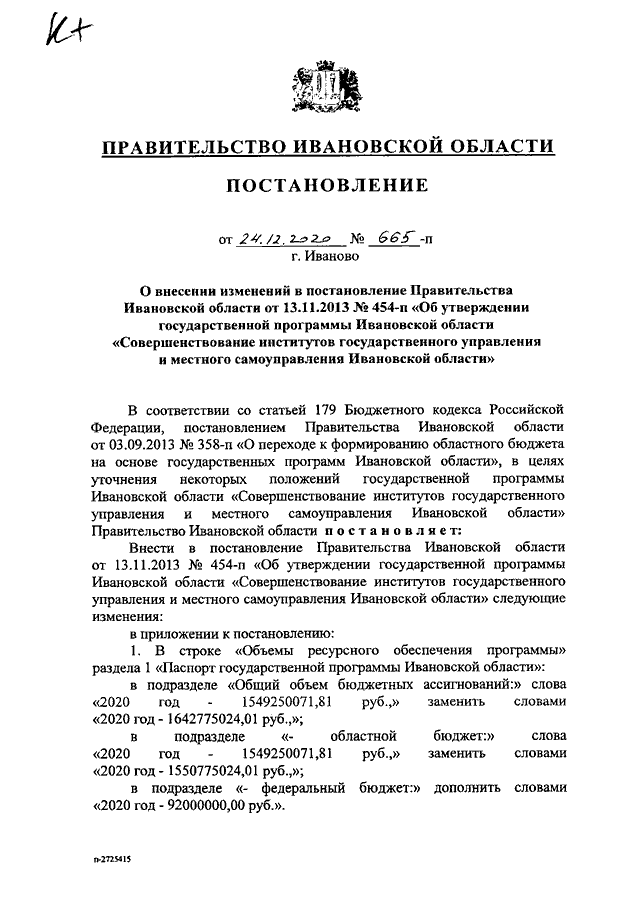 Постановление Правительства Ивановской области от 24.12.2020 N 665-п "О внесении изменений в постановление Правительства Ивановской области от 13.11.2013 N 454-п "Об утверждении государственной программы Ивановской области "Совершенствование институтов государственного управления и местного самоуправления Ивановской области"
