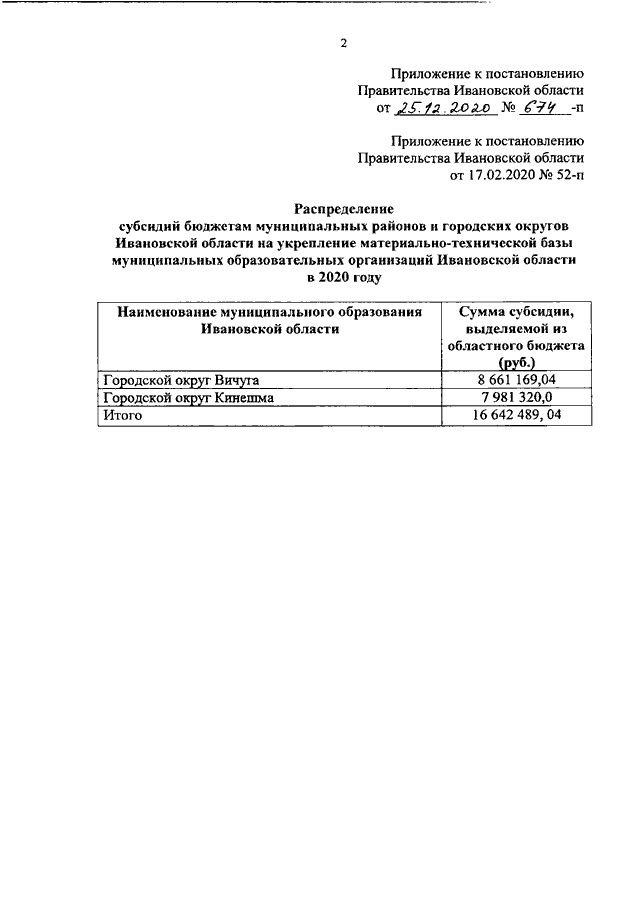 Постановление Правительства Ивановской области от 25.12.2020 N 674-п "О внесении изменения в постановление Правительства Ивановской области от 17.02.2020 N 52-п "О распределении субсидий бюджетам муниципальных районов и городских округов Ивановской области на укрепление материально-технической базы муниципальных образовательных организаций Ивановской области в 2020 году"