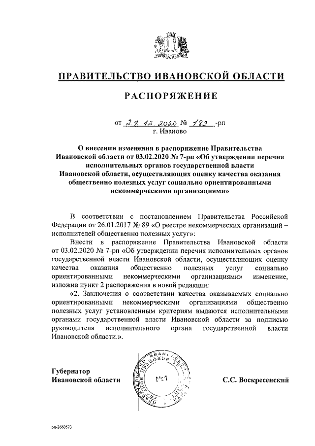 Распоряжение Правительства Ивановской области от 28.12.2020 N 189-рп "О внесении изменения в распоряжение Правительства Ивановской области от 03.02.2020 N 7-рп "Об утверждении перечня исполнительных органов государственной власти Ивановской области, осуществляющих оценку качества оказания общественно полезных услуг социально ориентированными некоммерческими организациями"
