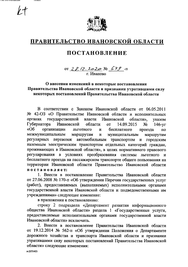 Постановление Правительства Ивановской области от 28.12.2020 N 679-п "О внесении изменений в некоторые постановления Правительства Ивановской области и признании утратившими силу некоторых постановлений Правительства Ивановской области"