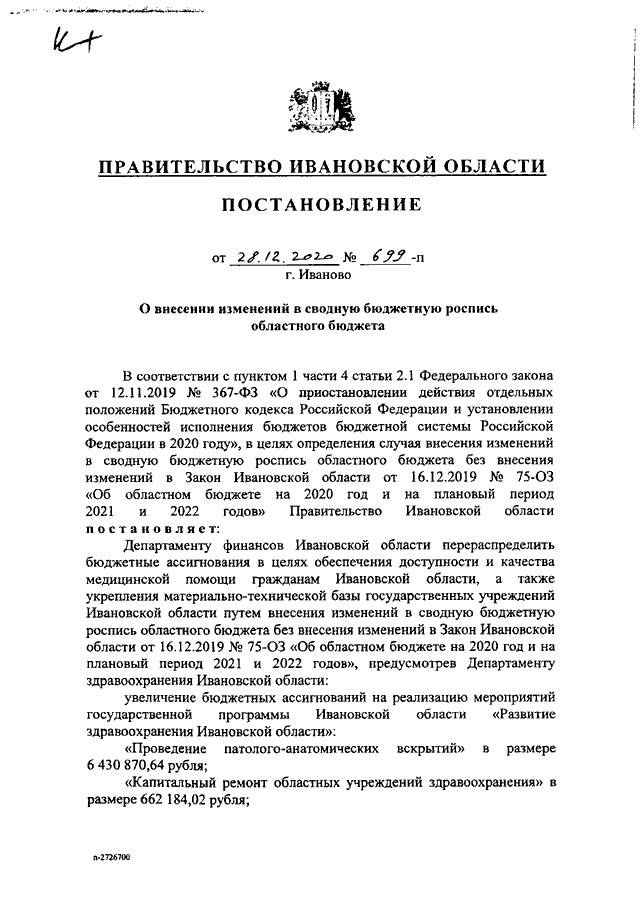 Постановление Правительства Ивановской области от 28.12.2020 N 699-п "О внесении изменений в сводную бюджетную роспись областного бюджета"