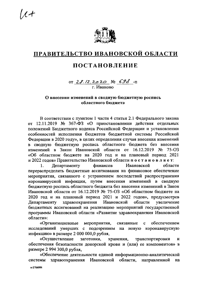 Постановление Правительства Ивановской области от 28.12.2020 N 698-п "О внесении изменений в сводную бюджетную роспись областного бюджета"