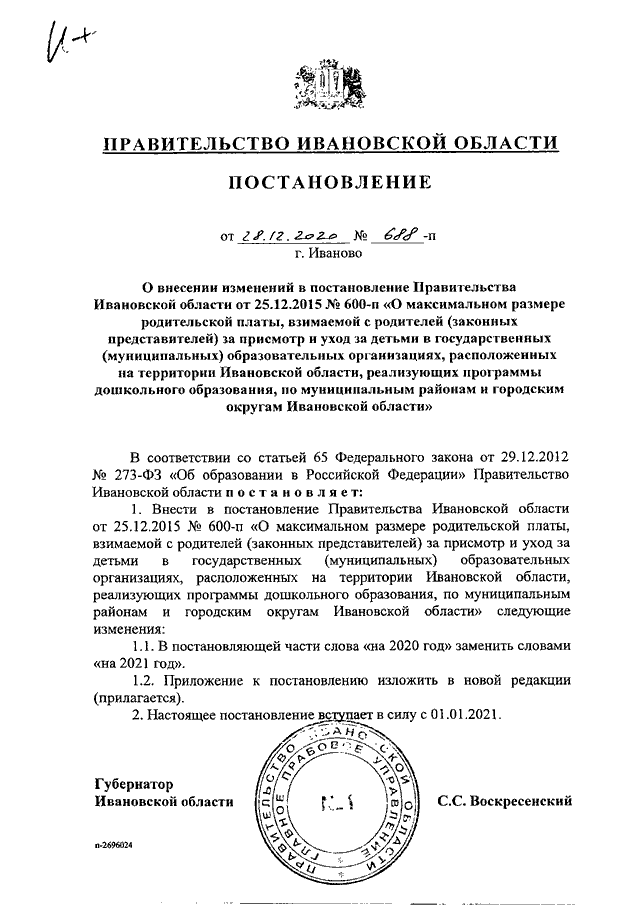 Постановление Правительства Ивановской области от 28.12.2020 N 688-п "О внесении изменений в постановление Правительства Ивановской области от 25.12.2015 N 600-п "О максимальном размере родительской платы, взимаемой с родителей (законных представителей) за присмотр и уход за детьми в государственных (муниципальных) образовательных организациях, расположенных на территории Ивановской области, реализующих программы дошкольного образования, по муниципальным районам и городским округам Ивановской области"
