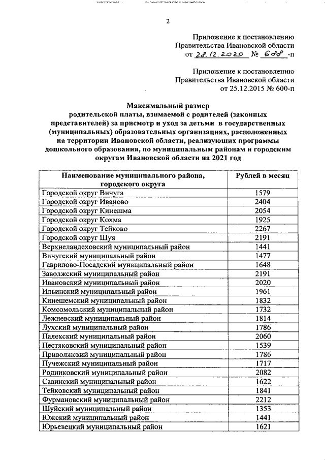 Постановление Правительства Ивановской области от 28.12.2020 N 688-п "О внесении изменений в постановление Правительства Ивановской области от 25.12.2015 N 600-п "О максимальном размере родительской платы, взимаемой с родителей (законных представителей) за присмотр и уход за детьми в государственных (муниципальных) образовательных организациях, расположенных на территории Ивановской области, реализующих программы дошкольного образования, по муниципальным районам и городским округам Ивановской области"