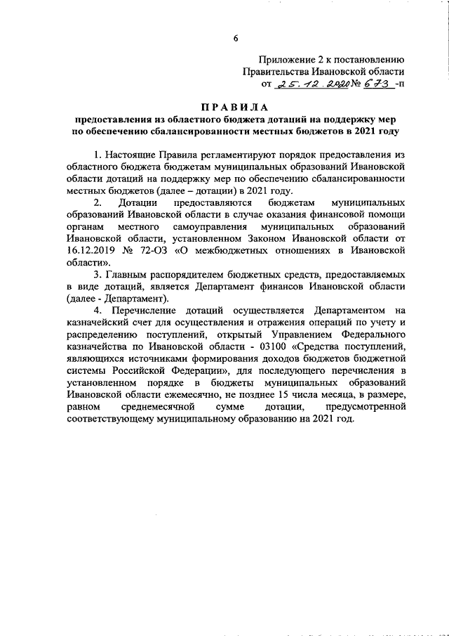 Постановление Правительства Ивановской области от 25.12.2020 N 673-п "О дотациях на поддержку мер по обеспечению сбалансированности местных бюджетов в 2021 году" (вместе с "Методикой распределения из областного бюджета дотаций на поддержку мер по обеспечению сбалансированности местных бюджетов в 2021 году", "Правилами предоставления из областного бюджета дотаций на поддержку мер по обеспечению сбалансированности местных бюджетов в 2021 году")