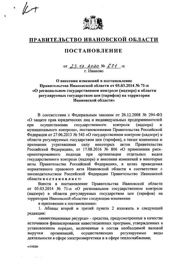 Постановление Правительства Ивановской области от 25.12.2020 N 671-п "О внесении изменений в постановление Правительства Ивановской области от 05.03.2014 N 71-п "О региональном государственном контроле (надзоре) в области регулируемых государством цен (тарифов) на территории Ивановской области"