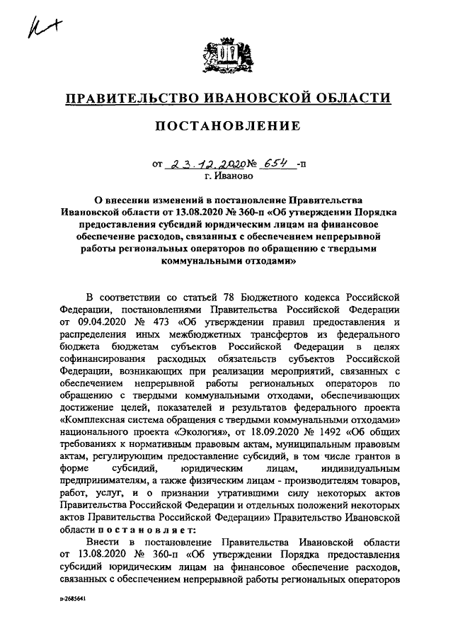 Постановление Правительства Ивановской области от 23.12.2020 N 654-п "О внесении изменений в постановление Правительства Ивановской области от 13.08.2020 N 360-п "Об утверждении Порядка предоставления субсидий юридическим лицам на финансовое обеспечение расходов, связанных с обеспечением непрерывной работы региональных операторов по обращению с твердыми коммунальными отходами"