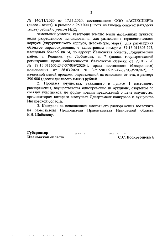 Распоряжение Правительства Ивановской области от 28.12.2020 N 188-рп "О продаже имущества, находящегося в собственности Ивановской области, закрепленного на праве оперативного управления за областным бюджетным учреждением здравоохранения "Родниковская центральная районная больница"