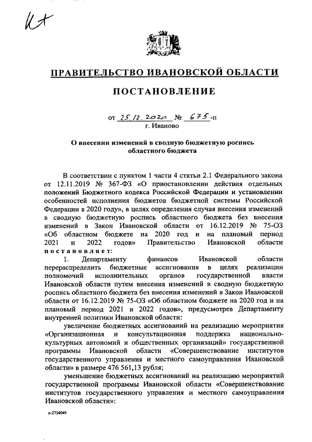 Постановление Правительства Ивановской области от 25.12.2020 N 675-п "О внесении изменений в сводную бюджетную роспись областного бюджета"