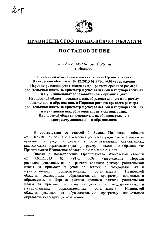 Постановление Правительства Ивановской области от 28.12.2020 N 696-п "О внесении изменений в постановление Правительства Ивановской области от 09.12.2013 N 491-п "Об утверждении Перечня расходов, учитываемых при расчете среднего размера родительской платы за присмотр и уход за детьми в государственных и муниципальных образовательных организациях Ивановской области, реализующих образовательную программу дошкольного образования, и Порядка расчета среднего размера родительской платы за присмотр и уход за детьми в государственных и муниципальных образовательных организациях Ивановской области, реализующих образовательную программу дошкольного образования"