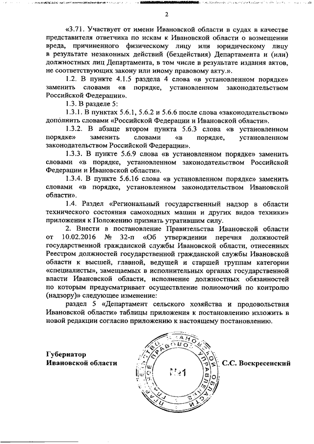 Постановление Правительства Ивановской области от 28.12.2020 N 694-п "О внесении изменений в постановления Правительства Ивановской области от 07.11.2012 N 439-п "Об утверждении Положения о Департаменте сельского хозяйства и продовольствия Ивановской области" и от 10.02.2016 N 32-п "Об утверждении перечня должностей государственной гражданской службы Ивановской области, отнесенных Реестром должностей государственной гражданской службы Ивановской области к высшей, главной, ведущей и старшей группам категории "специалисты", замещаемых в исполнительных органах государственной власти Ивановской области, исполнение должностных обязанностей по которым предусматривает осуществление полномочий по контролю (надзору)"